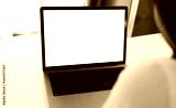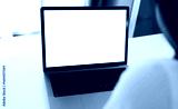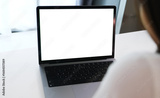 Laptop computer screen mockup, template background, Hand typing laptop computer with blank screen, Business online, e commerce, online study concept