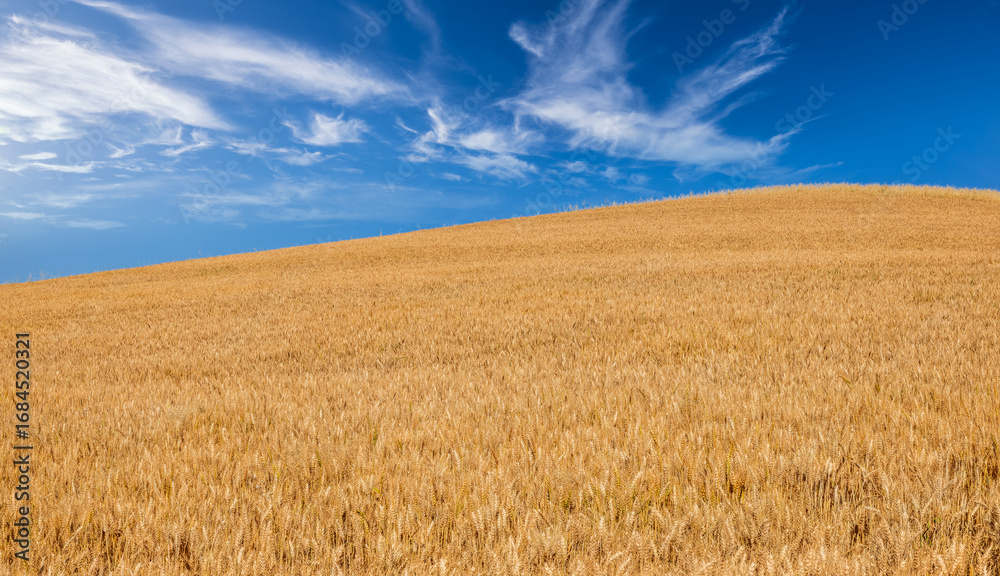 Golden ripe wheat field on a rolling hill against beautiful blue sky in summer