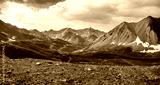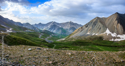 Winding mountain road snakes through green valley with majestic peaks under a cloudy sky