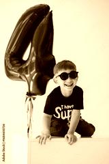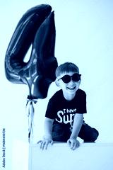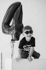 A joyful child is delightfully celebrating their fourth birthday, surrounded by a fun black balloon shaped like the number 4, while stylishly wearing cool sunglasses that add to the festive mood