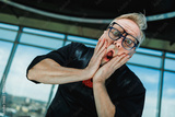 In a modern office space, a surprised businessman displays both shock and excitement, vividly reflecting the energetic and enthusiastic spirit of collaboration among the team members present