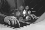 Digital e-learning concept with icons of graduation cap, online education, training, and knowledge sharing on tablet and laptop, representing modern technology, study, and online learning platforms.