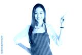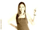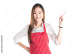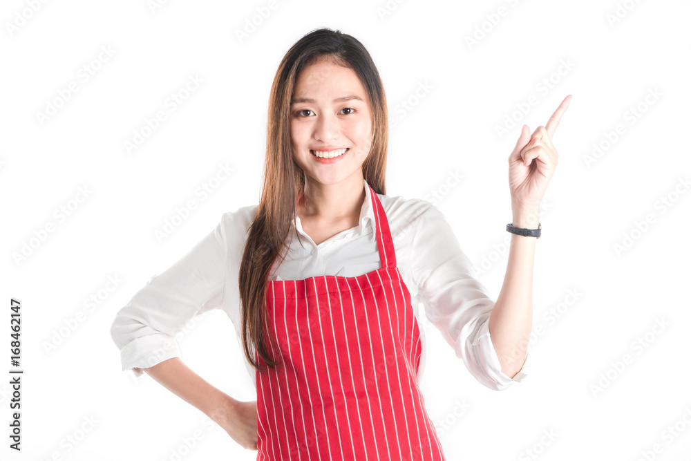 Portrait of Smiling beautiful young Asian woman wear red apron and hand pointing with copy space for your text or advertising isolated on white.