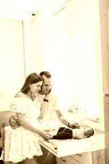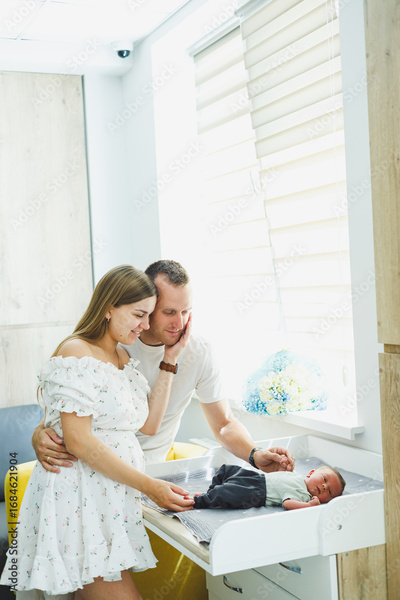 In a bright and beautifully decorated nursery, new parents are showing immense adoration and love for their precious newborn, creating cherished family bonding moments filled with joy and happiness