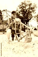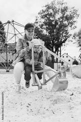 Experience joy at the playground A memorable bonding moment between a mother and her excited child using a sand excavator, showcasing their special connection and thrilling adventure