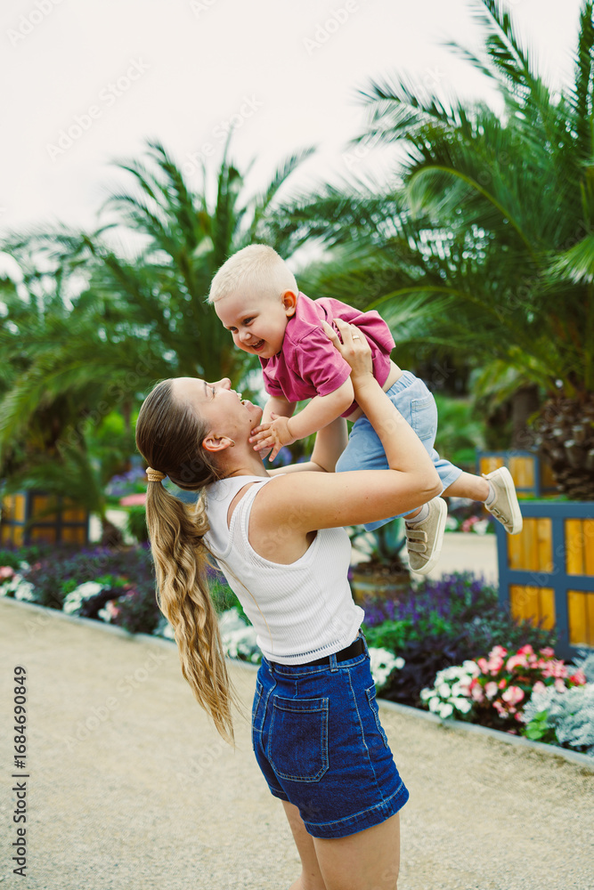A Joyful and Heartwarming Moment A Loving Mother Lifting Her Baby High in a Beautiful Tropical Garden Setting, Surrounded by Vibrant Flowers and Lush Greenery, Exuding Happiness and Togetherness