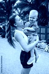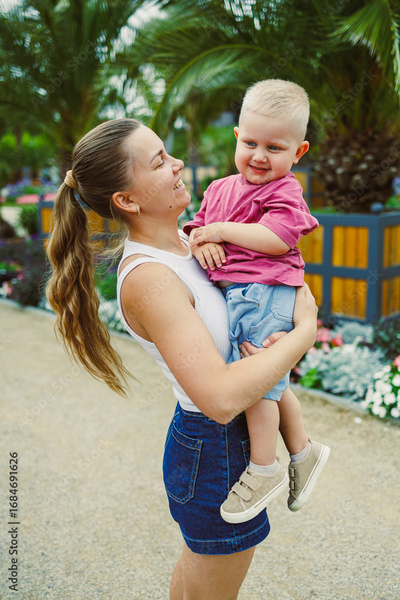 A Joyful Moment A loving mother holding her beaming son in a lush and vibrant outdoor setting, surrounded by natures beauty, creating a picturesque memory filled with happiness and warmth