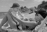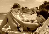 Photo of a mother in her early 40's laying on a sunbed, holding her infant child at a beautiful beach by Kakoudia Rock