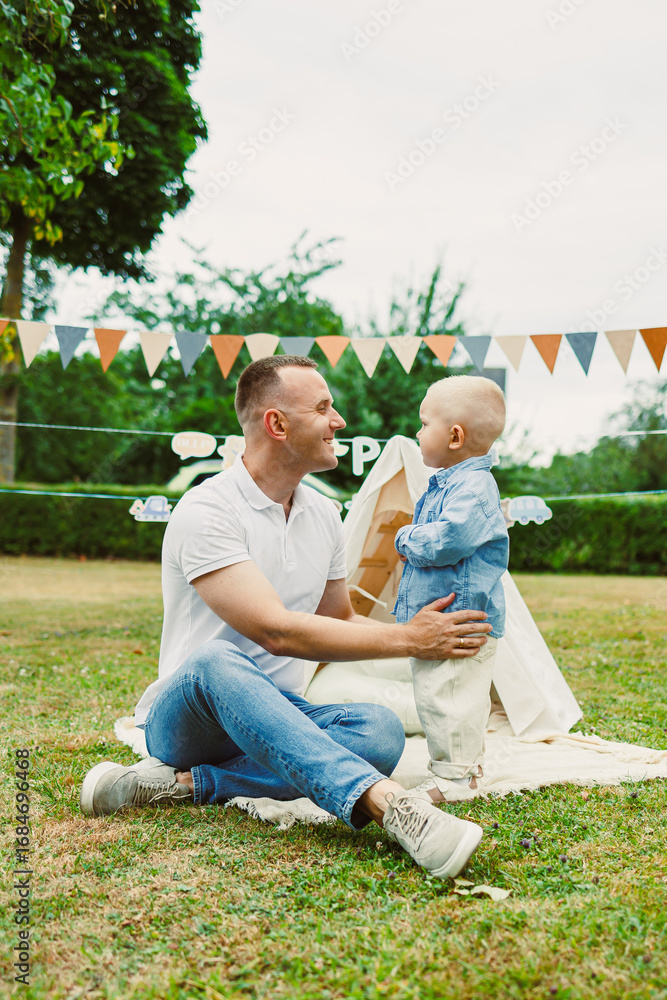 Heartwarming Outdoor Moments A Father and Child Bonding in Close Proximity Near a Brightly Colorful Banner Displayed for All to See, Celebrating Their Love and Joyful Interactions Together