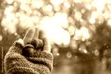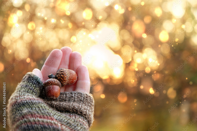 Beautiful autumn background. ripe brown acorns in hand close up outdoor, blurred sunny nature backdrop. symbol of cozy fall season. copy space. template for design