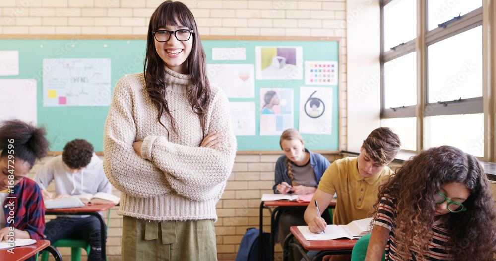 Portrait, tutor and woman with arms crossed, classroom or pride for teaching children and education. Knowledge, teacher and person with smile in school, teens and writing exam for curriculum or learn