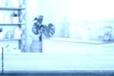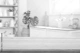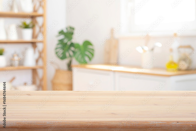 Close-up wooden table top on blurred bright rustic kitchen interior background