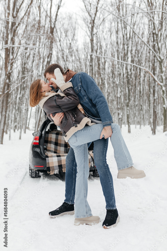 A Romantic Winter Kiss A Young Couple Embracing in a Gorgeous, Picturesque Snowy Landscape Right Next to Their Car, Sharing Warmth and Love While Surrounded by the Chilly Winter Air