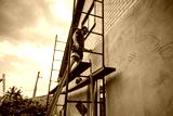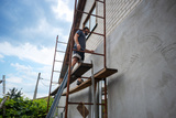Worker on scaffolding plastering a house exterior, showcasing home renovation and construction. Emphasizes wall finishing and building maintenance under a clear sky.