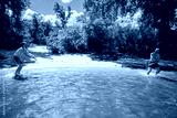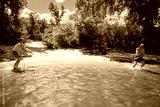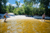 Friends playing volleyball in shallow river water on a sunny day, enjoying summer leisure by the sandy bank surrounded by lush green trees.