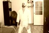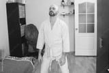 Focused man in white karate gi meditating or practicing martial arts at home. Represents discipline, mindfulness, and a healthy lifestyle. Perfect for wellness, fitness, or personal growth concepts.