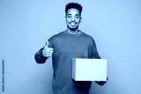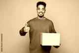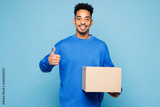 Young happy fun man of African American ethnicity wears sweatshirt casual clothes hold blank cardboard box show thumb up isolated on plain pastel light blue cyan background studio. Lifestyle concept.