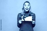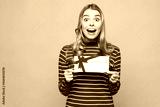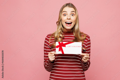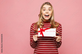Young happy woman she wear red striped sweatshirt casual clothes hold gift certificate coupon voucher card for store isolated on plain pastel light pink background studio portrait. Lifestyle concept.