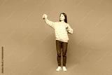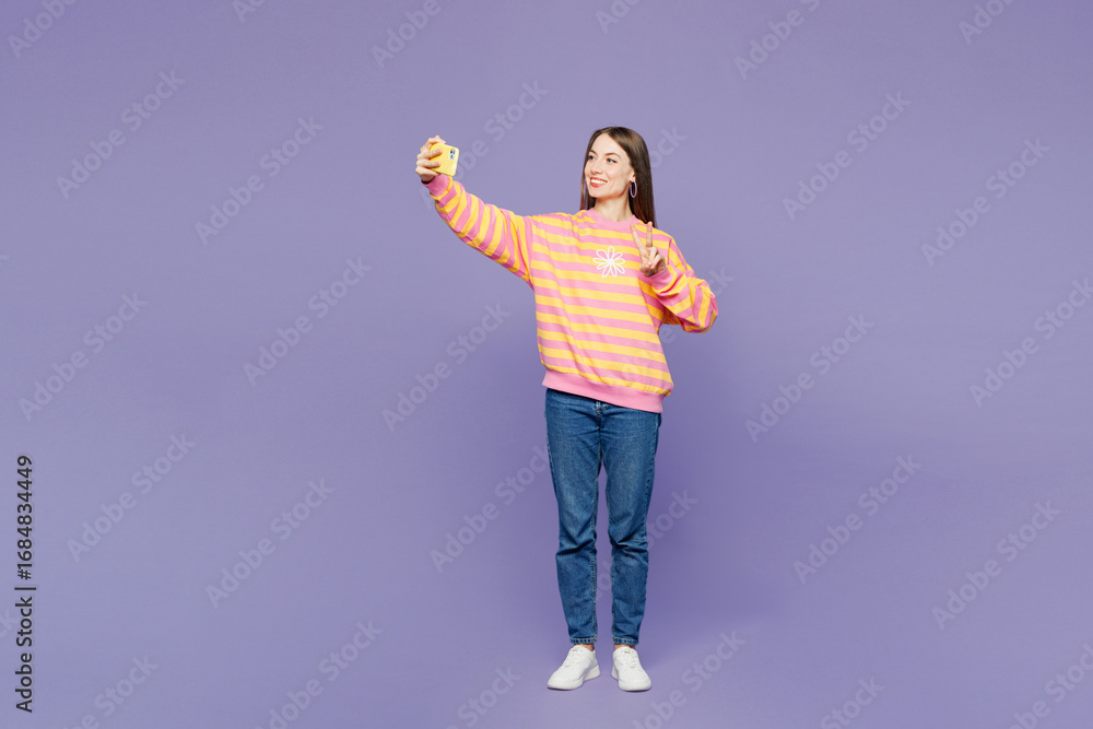 Full body young woman she wears yellow sweatshirt casual clothes doing selfie shot on mobile cell phone post photo on social network show v-sign isolated on plain purple background. Lifestyle concept.