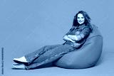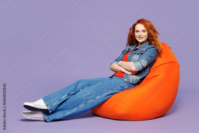 Full body side view young ginger woman she wears red t-shirt denim shirt sit in bag chair hold hands crossed folded isolated on plain pastel light purple background studio portrait. Lifestyle concept.