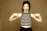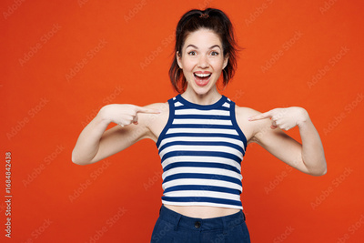 Young shocked surprised overjoyed woman she wears blue striped tank top casual clothes point index finger on herself isolated on plain red orange color background studio portrait. Lifestyle concept.
