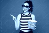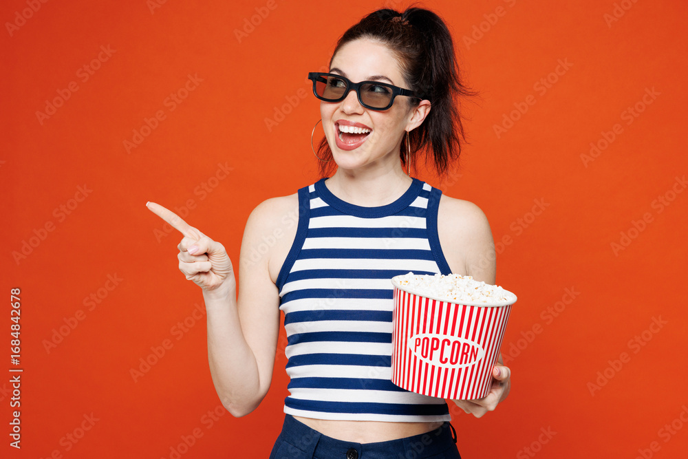 Young woman she wear blue striped tank top casual clothes 3d glasses watch movie film hold bucket of popcorn in cinema point finger aside isolated on plain red orange color background studio portrait