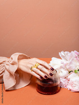 Elegant hand with burgundy manicure touching ribbed glass with dark drink and flowers