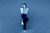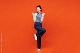 Full body young woman she wears blue striped tank top casual clothes doing winner gesture celebrate clenching fists say yes isolated on plain red orange background studio portrait. Lifestyle concept.