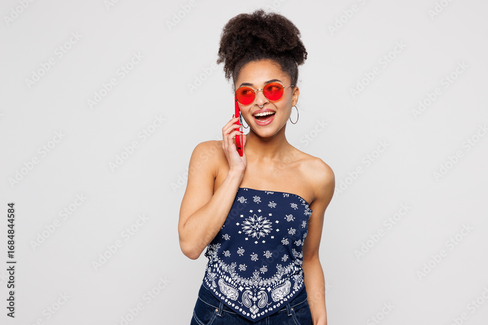 Young smiling happy woman wear blue bandana top casual clothes sunglasses talk speak on mobile cell phone conducting pleasant conversation isolated on plain solid white background. Lifestyle concept.