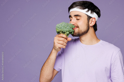 Young happy strong fitness trainer instructor sporty man sportsman wear headband t-shirt training in home gym hold eat sniff broccoli isolated on plain purple background Workout sport fit abs concept