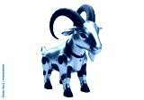Isolated robotic goat toy figurine with shiny silver metal and dark horns and hooves