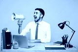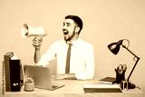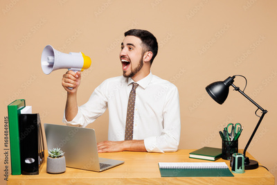 Young employee business man wear shirt tie sit work at office desk with pc laptop scream in megaphone announces discounts sale Hurry up isolated on plain beige background. Achievement career concept.