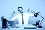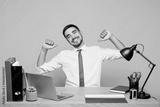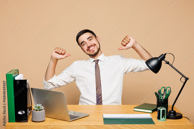 Young happy successful employee business man wear white shirt tie sit work at office desk with pc laptop point thumb fingers on himself isolated on plain beige background. Achievement career concept.