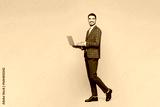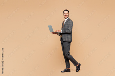 Full body side view young successful employee IT business man corporate lawyer wears classic grey suit shirt tie work in office hold use laptop pc computer isolated on plain beige background studio.