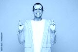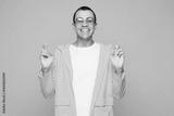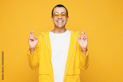 Young middle eastern man he wear raincoat casual clothes sunglasses waiting for special moment, keep fingers crossed, making wish isolated on plain yellow orange background studio. Lifestyle concept.