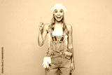 Young smart employee laborer handyman woman wear denim overhaul point index finger up with new idea isolated on plain pink background. Instruments for renovation apartment room. Repair home concept.