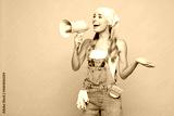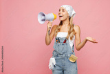 Young laborer handyman woman wear denim overhaul hold megaphone scream announces discounts sale Hurry up isolated on plain pink background. Instruments renovation apartment room. Repair home concept.