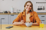 Young smiling happy housewife woman wear orange shirt casual clothes eat breakfast muesli cereals with milk fruit in bowl sit at table in light kitchen at home alone. Lifestyle cooking food concept.