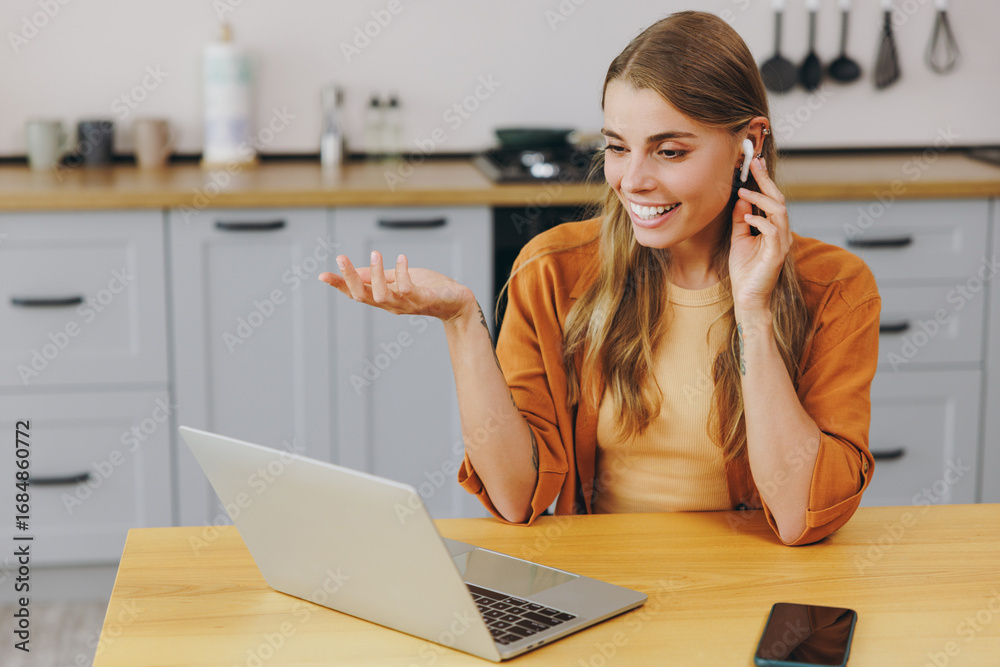 Young happy housewife IT woman wear orange shirt casual clothes earphones hold use work on laptop pc computer get video call sit at table in light kitchen at home alone Lifestyle cooking food concept
