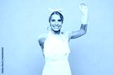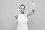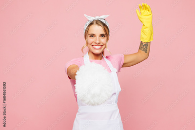 Young happy woman wears white apron use feather duster pov fencing fight while doing housework tidy up look camera isolated on plain pastel light pink background studio portrait. Housekeeping concept.