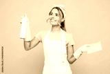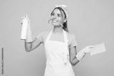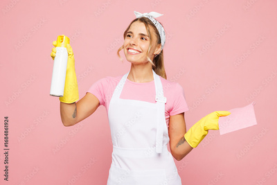 Young happy woman she wear white apron gloves hold surface cleaner spray in bottle wiping with cloth while doing housework tidy up isolated on plain pastel light pink background. Housekeeping concept.