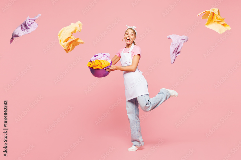 Full body young woman wear white apron hold basin with wet clothes after laundry while doing housework tidy up sniff fresh clothes isolated on plain pastel light pink background. Housekeeping concept.