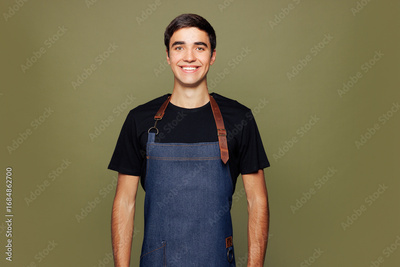 Young smiling happy man barista bartender barman employee he wear jeans apron black t-shirt work in coffee shop look camera isolated on plain green background studio. Small business startup concept.