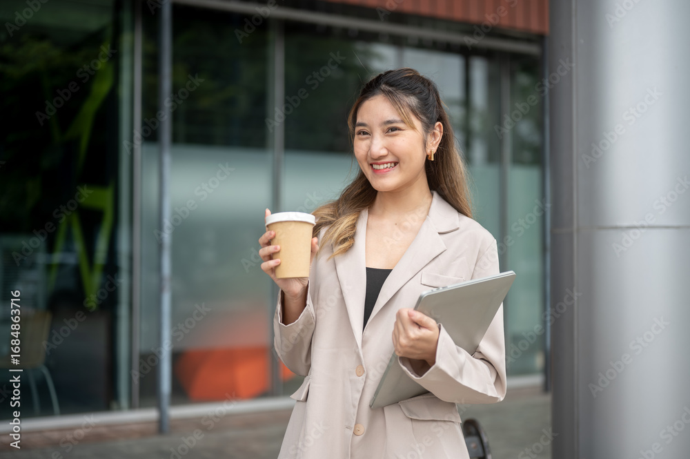 Beautiful asian woman holding coffee cup and carrying a laptop while standing in front of the store.