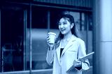 Beautiful asian woman holding coffee cup and carrying a laptop while standing in front of the shop.
