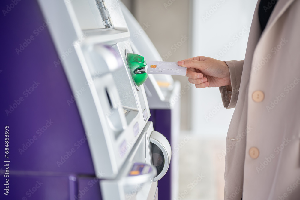 Close up of woman's hand inserting atm card into a machine to withdraw money or making a transaction