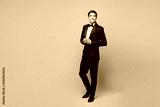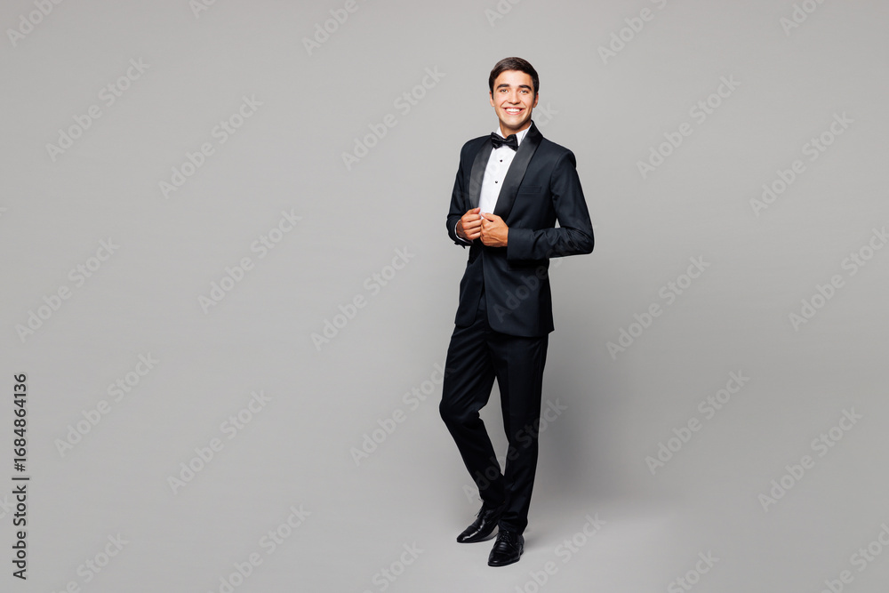 Full body young handsome Caucasian business man he wear shirt black suit bow tie elegant uniform posing look camera isolated on plain pastel light grey background studio portrait. Lifestyle concept.