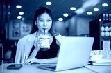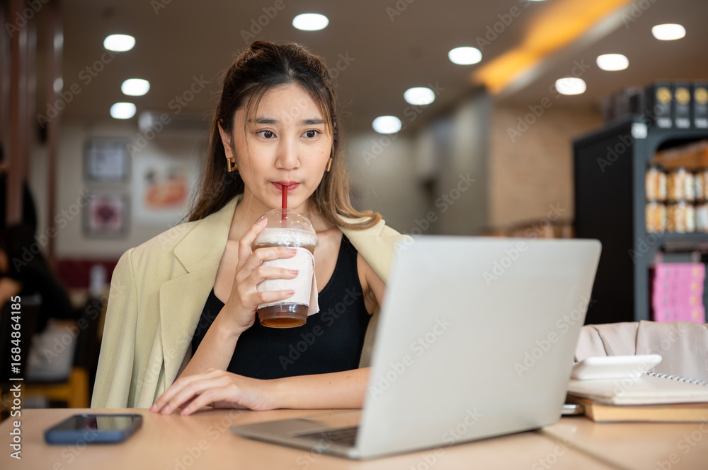 Asian woman enjoy drinking iced tea or coffee while looking at laptop on wooden table in the cafe.