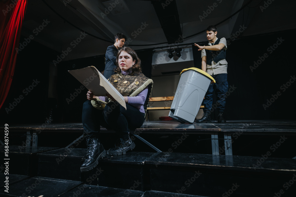 A group of young actors involved in a dramatic theatrical performance, conveying emotions and interactions in a stage environment.