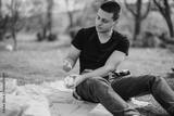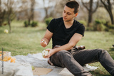 A young man relaxes outdoors, seated on a blanket during a picnic, peeling an apple.